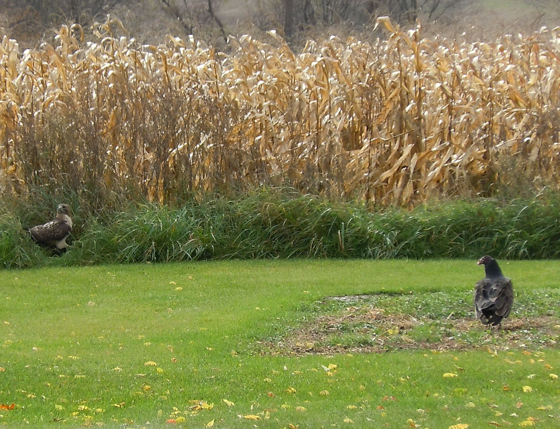 This is just before the Hawk took flight, the carcass was in the yard about 10 feet from where the hawk is, and he jumped 3-4 times to get his prize in the tall grass just before the vultures landed.