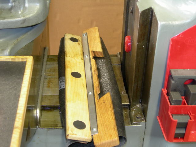 In monitoring the traffic on this page I thought it appropriate to add a couple of pic’s and explain how I made these accessories, keep in mind that I used whatever I could find lying around without spending a pile of money. The ways cover is made of some scrap oak, a tool box drawer liner (purchased form Harbor Freight), some 1 inch round magnets that came from the hardware and some scrap aluminum from an old screen door all of which I had on hand. I had looked into purchasing a set of covers from an Industrial Supply but that was another $70 and when you attach them they are bolted on. I haven’t found any shortcomings so far and they seem to function as intended; they are removed for cleaning without unbolting anything and they adjust easily to whatever height the knee is set at, there is one large magnet on the column which is moved as needed when the height is changed. At this time I still haven’t made one for the front for I ran out of box liner and haven’t purchased any more.