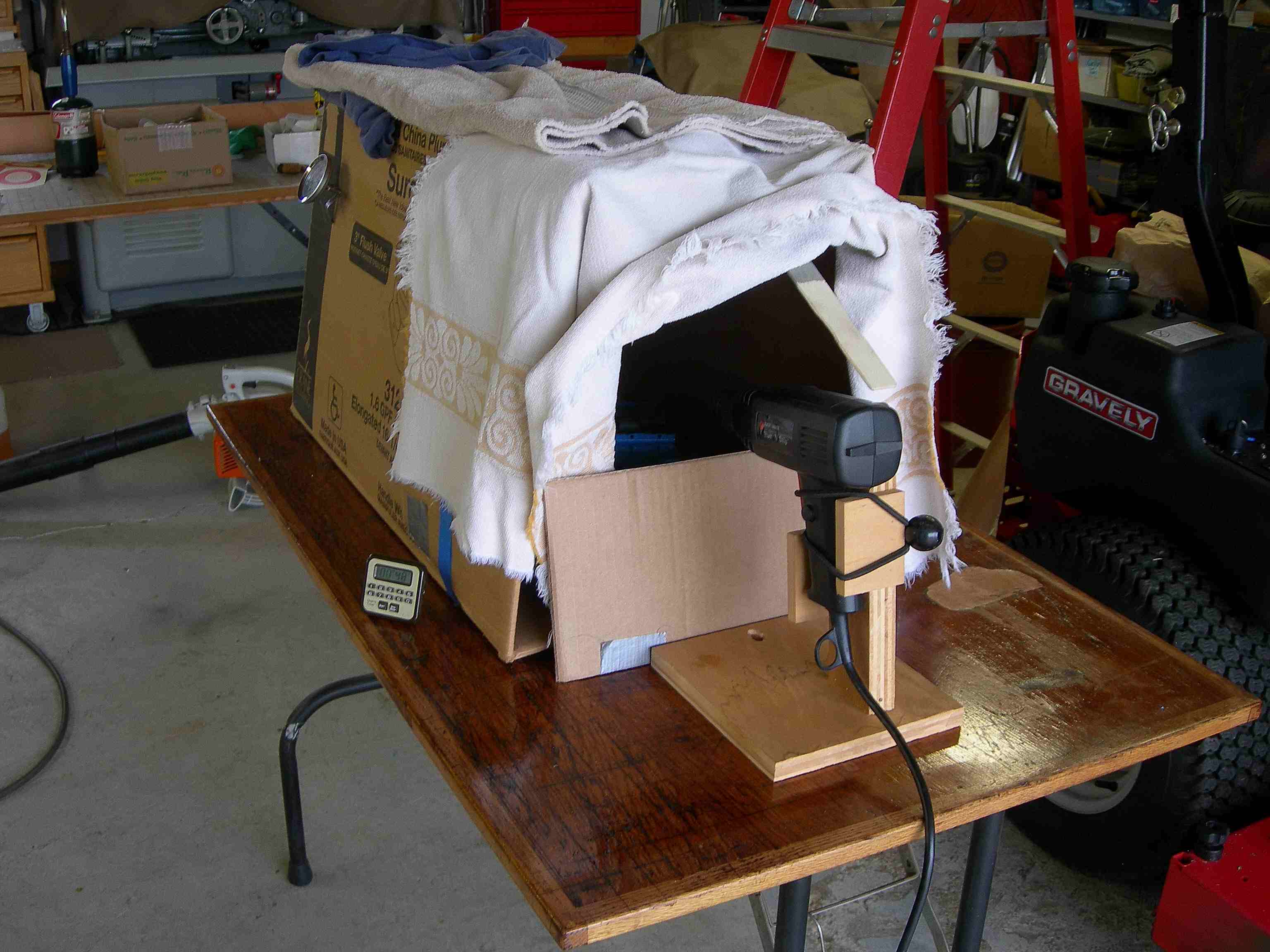 In use here is a large cardboard box; most any box would do as long as it is large enough that the work will fit inside. In the back is an approximate 1” x 3” vent hole at the top of the box, the front is completely open and at the back of the box close to the top is a lead thermometer. I suppose one could purchase a thermometer just for this application but I use what I have and it will read low enough to be able to tell 150 degrees that I want to maintain. Hey if someone wants to get elaborate feel free but for the once in a great while usage I really do not want some elaborate thing sitting around collecting dust and in my way.