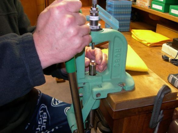 This last step in forming jacketed bullets is some what self explanatory other than setting the length. The only experience I have had is with the steel dies, they require more lube than carbide dies, I won’t get into the technical details between the two other than the life of steel is short compared to carbide. For most individuals steel will last a lifetime when making bullets for you and maybe a couple buddies, the cost difference between the two is considerable though, for that reason I chose Blackmon steel dies. With this set-up it mounts in the reverse of other manufactures dies, it doesn’t require an ejector frame as others and the die mounts in the ram instead of the head. The die set-up comes with a replacement ram for the press you choose and at that time you will be sent a drill guide to modify (drill a hole for the ejector pin (see pic)) the press. At the present time I have 4 presses modified for bullet making but only use 2, as most I began with one press but soon found that multiple presses just made things easier.