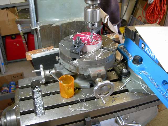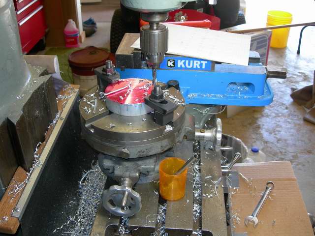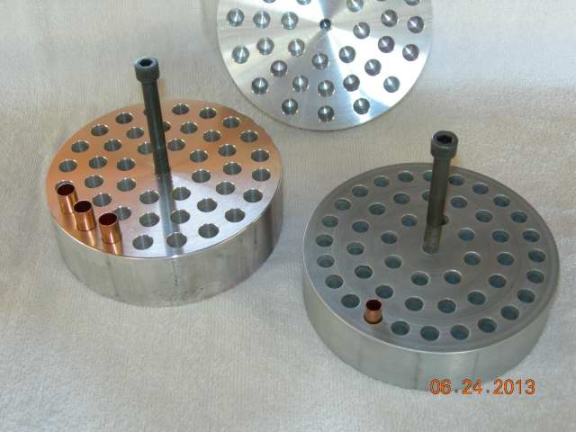 As the brain works (mine is off the grid at times) I had this epiphany, I would build a heat-sink from aluminum, drill a vast amount of holes just large enough to hold bullet jackets at ¾ depth of there length. This heat-sink would be round, somewhere around 1 inch thick, approximately 4 inches in diameter so it would fit over a propane stove burner and have some sort of center rod/ hook so it could be removed from the burner with tongs or pliers at the point the cores melted. Then when this bonding fixture is removed from the burner it could be placed on another heat-sink to draw the temperature down so the newly bonded jackets can be removed……………and so it came to pass that this epiphany actually works! This whole idea gave me an excuse to finally use my Palmgren rotary table……..(wish it were a true rotary table)