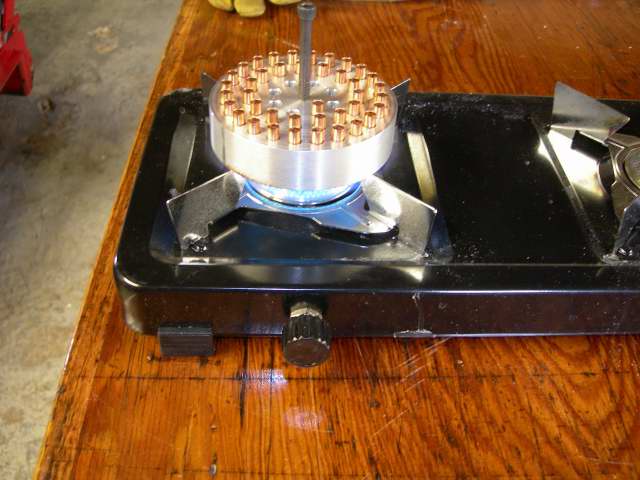 The small propane stove here works very well, it took 4 ½ to 5 minuets to melt the cores then they were removed and placed on another block of aluminum to cool.