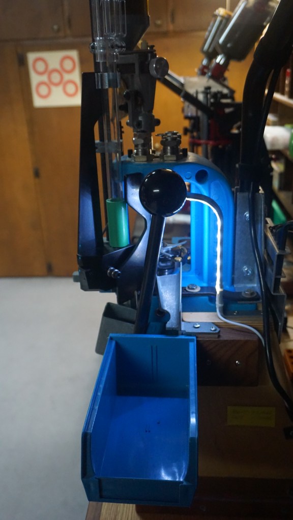 It would be nice to have a work light that fit the center hole, as far as I can tell nothing is available thru Dillon so I made my own. Amazon I found a sewing machine rope light, fashioned a bracket and mounted to the rear press bolt.